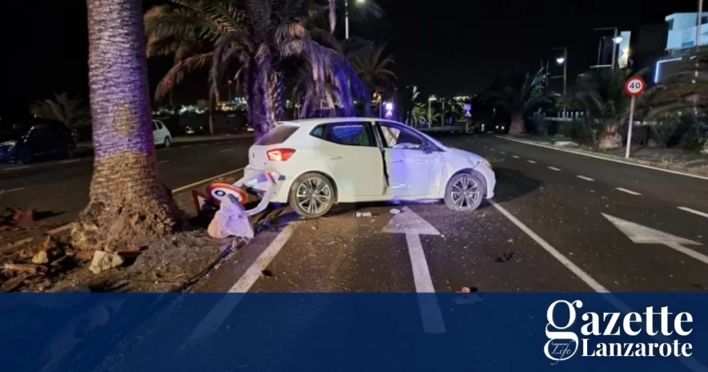 A vehicle collided with a streetlight, a palm tree and a traffic sign in Costa Teguise in the early hours